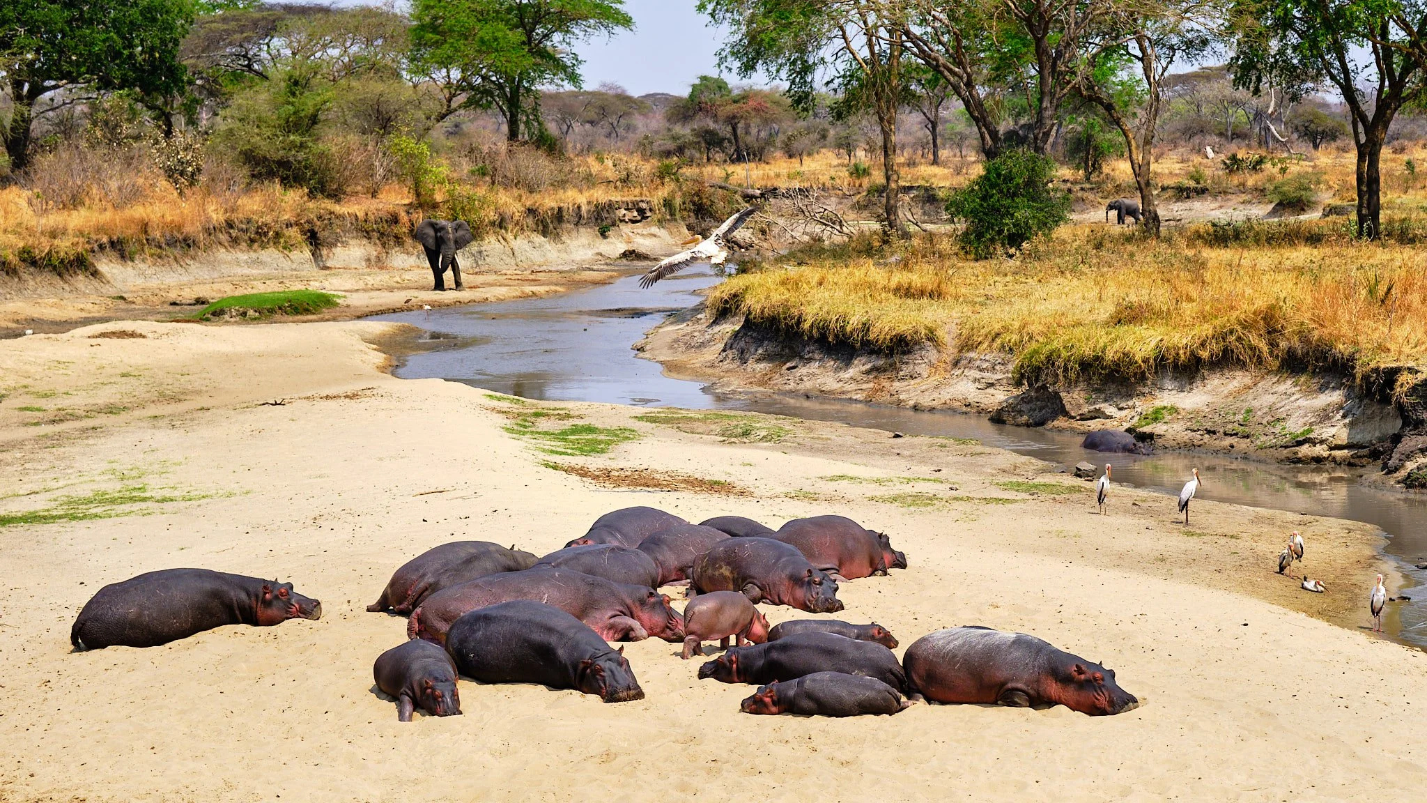 Katavi National Park is home to an impressive array of wildlife, including elephants, lions, leopards, buffaloes, giraffes, and zebras. The park is particularly famous for its large buffalo herds and dense hippo populations, which gather in shrinking water pools during the dry season.